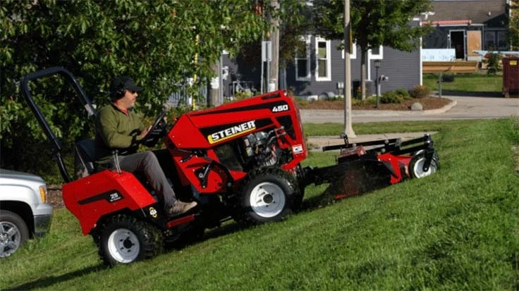The new tractor boasts a 25-horsepower, air-cooled engine and single-speed transmission. It features the same oscillating frame, articulated steering, four-wheel drive and Quick Hitch attachment system available on all Steiner 450 tractors. All models of the Steiner 450 are designed for use on slopes of up to 30 degrees when equipped with dual tires on front and rear axles.