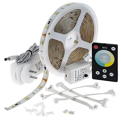 Each kit includes one 16 1/2 foot strip with 150 to 300 Epistar 3528 or 5050 SMD LEDs that produce pure white and/or thousands of other colors. The hand-held R remote controls white color temperature or RGB colors and modes such as color chasing, sequencing and static color.