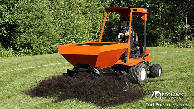 The ECO 600 Top Dresser Attachment is unique in Ecolawn Applicator’s line of broadcast top dressers. Its New Generation ECO 600 uses PTO drive, zero-turn technology, great visibility with frontal discharge and counterweight mechanisms for better weight distribution and stability. This makes handling heavier products feasible without sacrificing maneuverability or ease of operation.