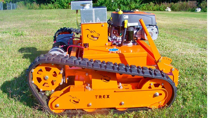 With a 20 HP remote start Kawasaki engine, and dual cutting blades, the TREX 44 can cut through high wet grass on slopes up to 50 degrees. The dual hybrid (electric) drive system allows for a zero turn radius while cutting forward or in reverse. Hybrid drive eliminates the need for hydraulic oil systems and reduces weight and cost. The track ground pressure is a minimal 1.16 lbs per square inch.