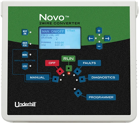 MISSION VIEJO, Calif. – The Underhill Novo 2Wire Converter is a new solution for expanding or renovating multi-wire irrigation systems. Compatible with all major controllers, Novo installs alongside the host multi-wire controller as part of a hybrid system and can manage up to 32 new two-wire stations.