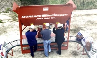 Features a feed hopper with three filling stations that release material when activated by a foot control