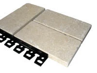 L-shaped edge restraint design installs flush against the stone in straight and radius installations