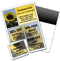 3½ by 5 inch postcard magnets Come with four customized coupon areas to offer customers seasonal specials Printed on eight point card stock High gloss finish 3½ by 2 inch magnetic strip on back