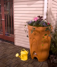 The RainXchange™ Rain Barrel, which can be incorporated into existing gutter and drainage systems has a 75-gallon capacity that allows for greater rainwater storage than most rain barrels on the marketplace today. The unit requires no electricity and the large internal overflow system keeps water in the barrel and away from the house. Durable plastic walls withstand extreme conditions and a 5-year warranty is included. A brass spigot can accept a garden hose for ease in irrigation. The childproof lockable lid has a screened gutter inlet and can be used as a planter to help naturalize the barrel into the landscape design. The attractive design is an aesthetic option for stormwater management over traditional rain barrels that tend to be an eyesore in the landscape.