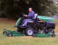 Three-deck rotary mower powered by 60 hp Perkins 404C turbo-charged diesel engine