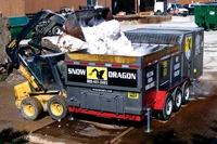 Snow and ice are deposited into a hot water bath equipped with heat exchanger tubes