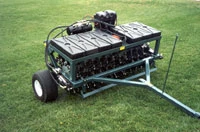 Equipped with 144 free-swinging tines that can be raised in and out of the ground by remote control from the driver's seat of turf vehicle