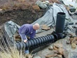 Angled and extendable slotted tube disperses water throughout an excavated bog area filled with stone and gravel