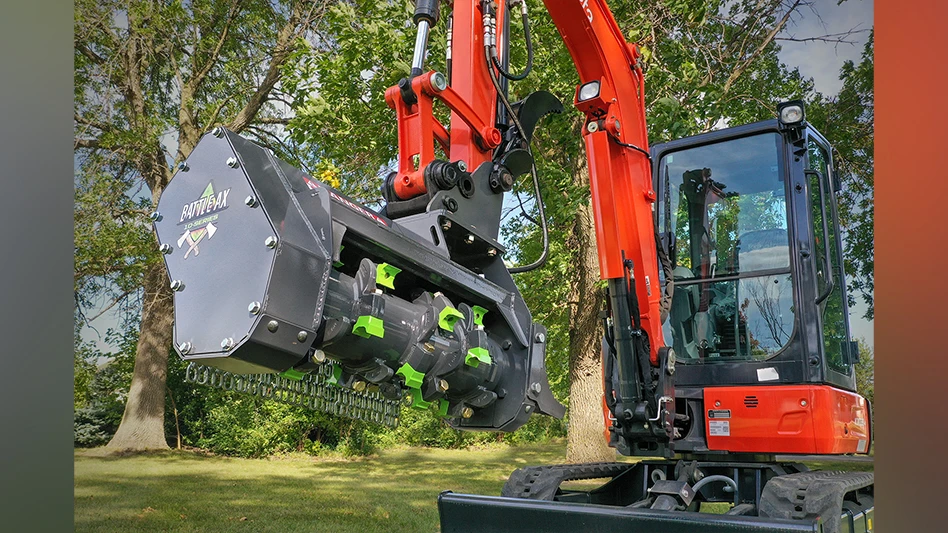 This mulcher eradicates materials to 10 inches in diameter with just 17 gpm of hydraulic flow and 3350 psi.